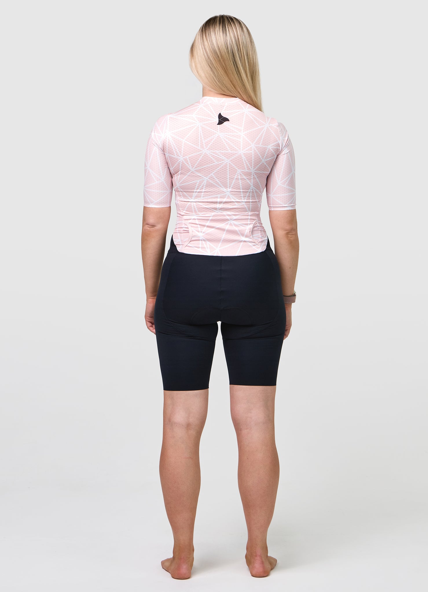 The longer sleeve uses Hex Dynamic Compression fabric which aids air flow and reduces wrinkling to optimize aerodynamic performance on the bike whilst a combination of individual quick drying and breathable fabrics has been used on the front, back and side panels to regulate body temperature and increase moisture wicking. On the lower half, PureBlack compression soft touch fabric is used to reduce lactic acid and provide a comfortable, yet secure fit, especially around the hips.