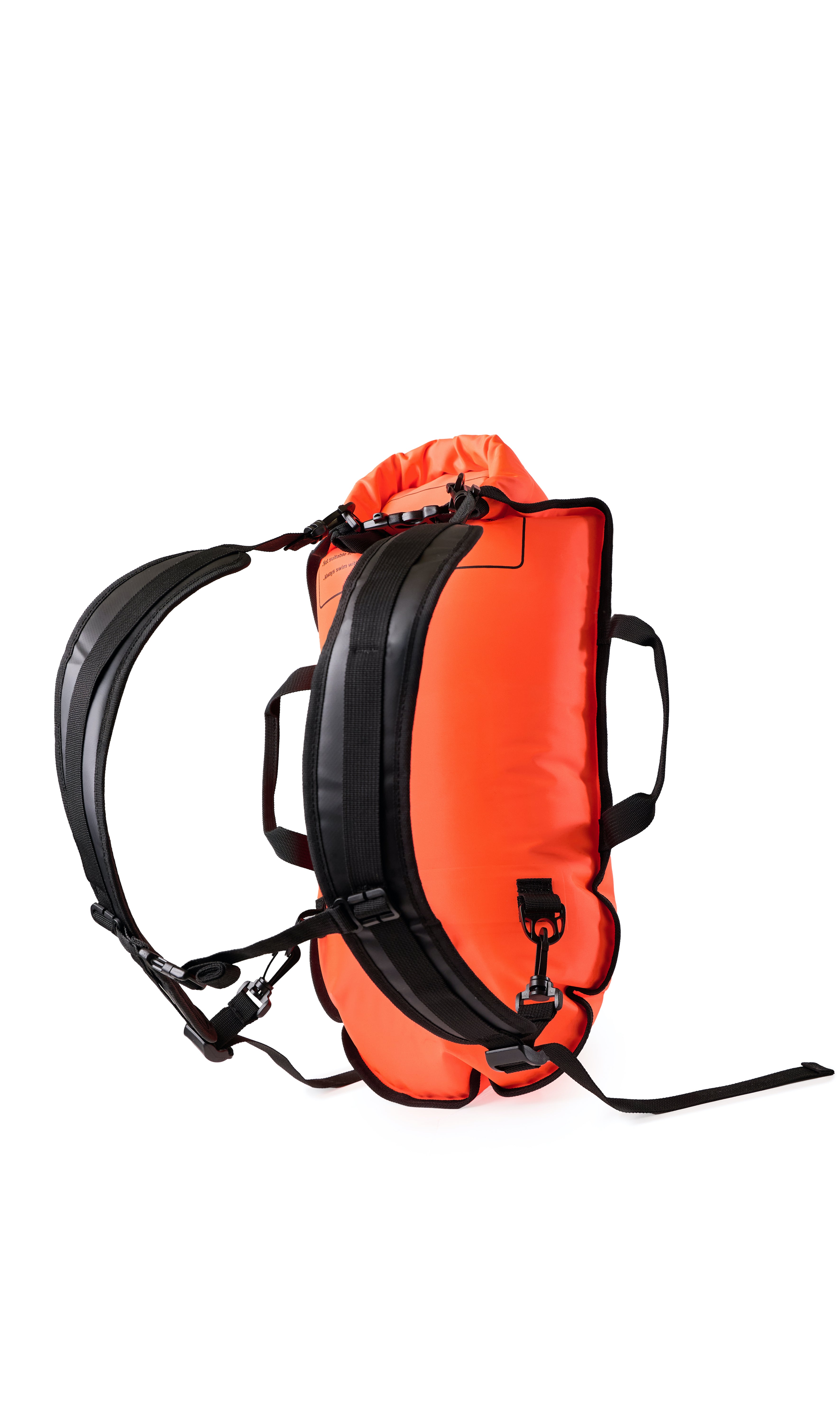 Out of the water, it functions as a fully waterproof 28-litre dry bag backpack, allowing you to carry your kit comfortably to and from your swim location. When it’s time to swim, the backpack straps are easily removed and stored inside, transforming the bag into a streamlined, high-visibility swim buoy.
