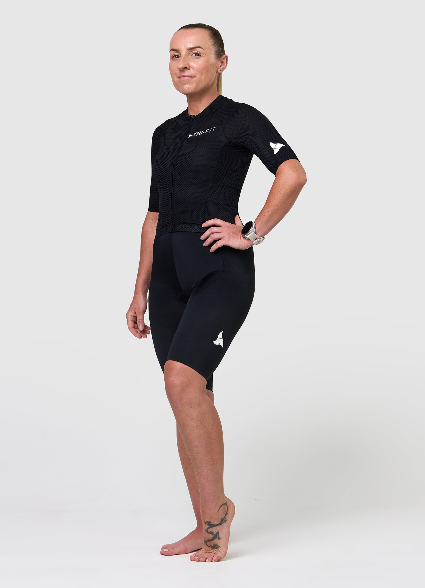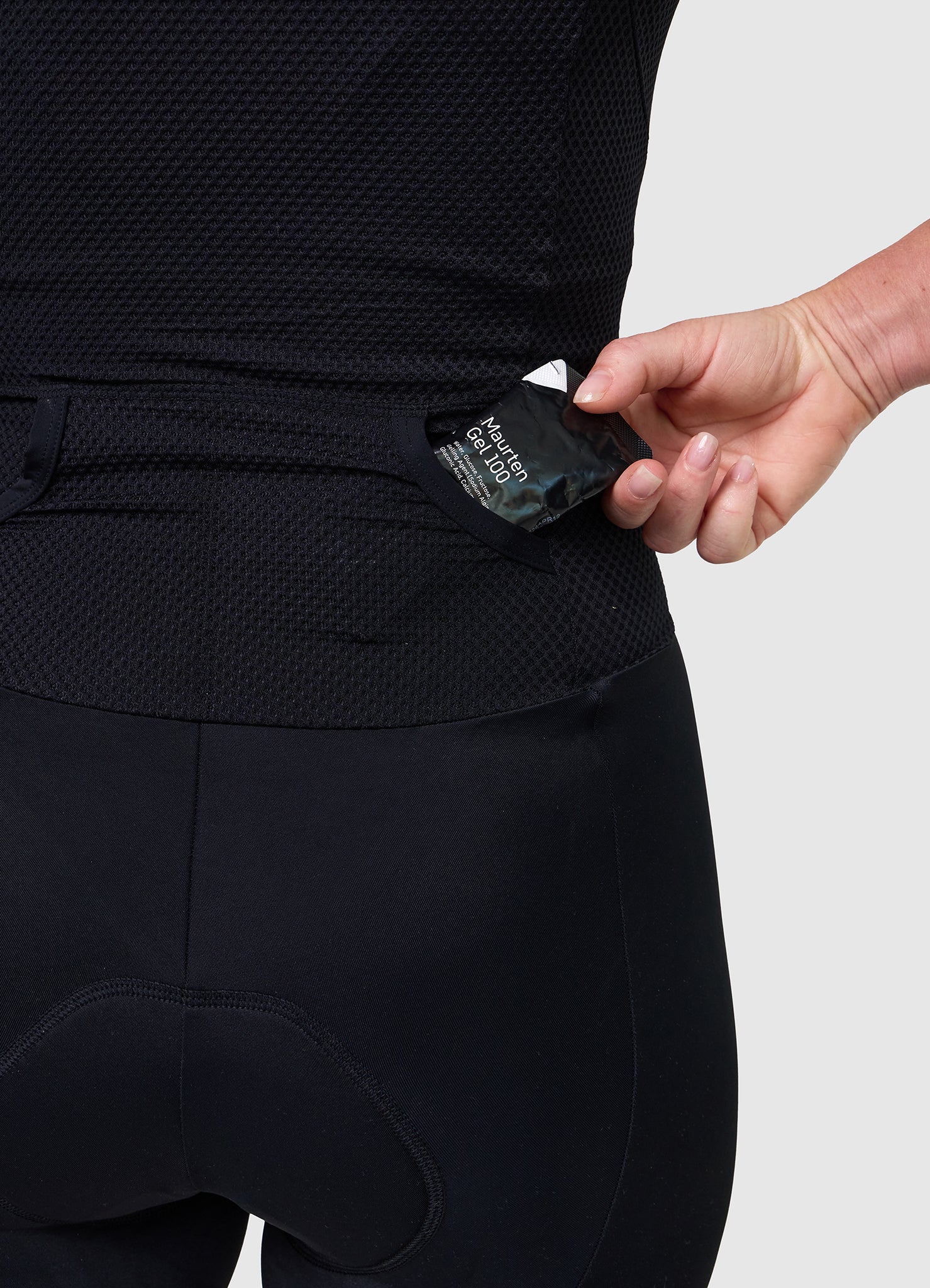 The laser-cut leg hems, printed silicone dot grippers, and internal silicone strip work together to keep the legs firmly in place without restriction. Meanwhile, the large rear aero pockets sit flat when empty and provide quick access to nutrition on the bike and run.