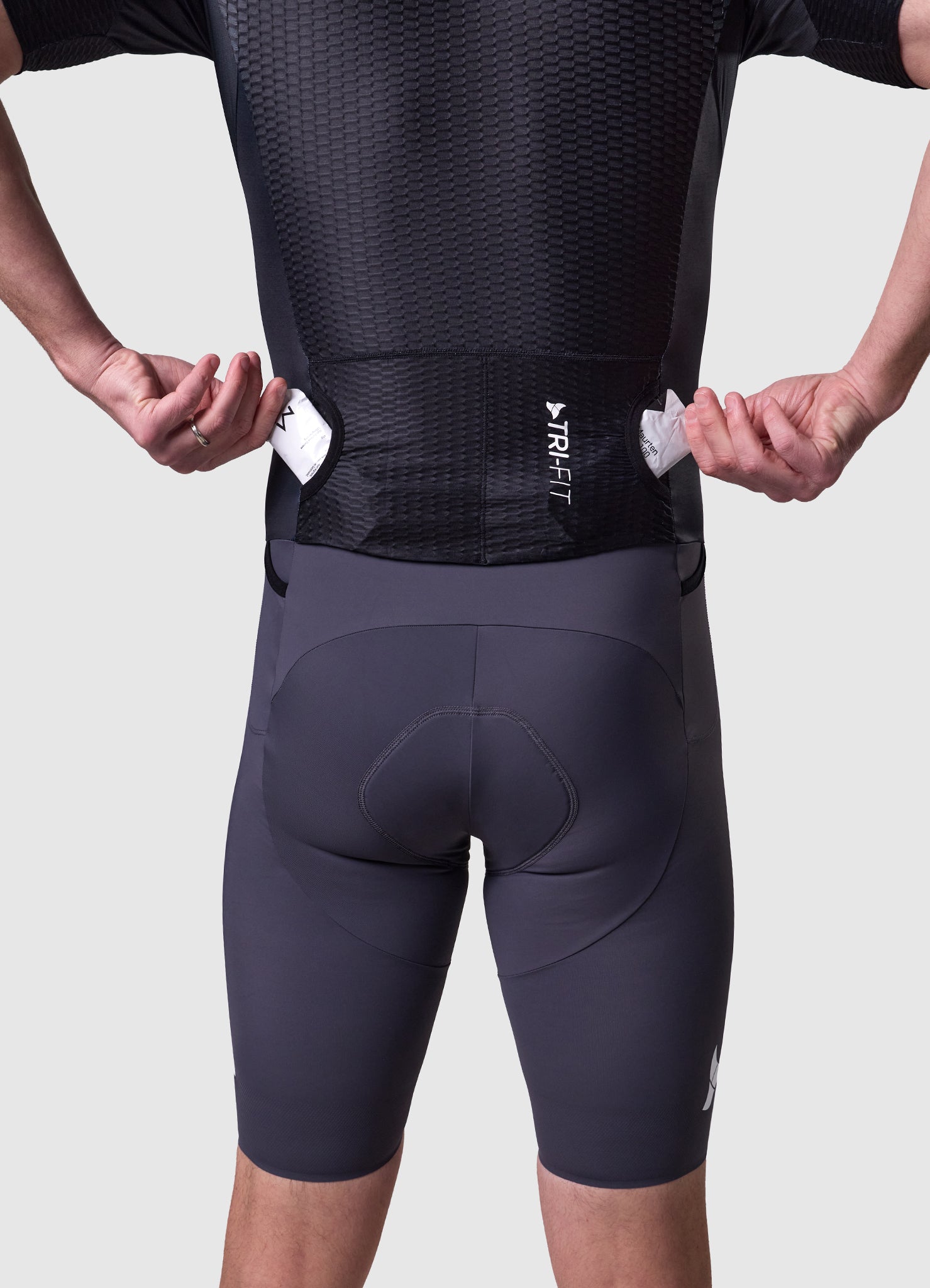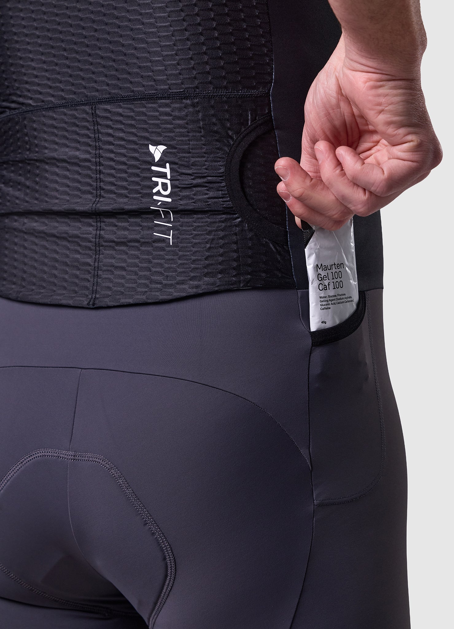 On the front is the same hand-picked Italian fabric, and external storage is taken care of with our unique side access, floating rear pocket and 2 discreet gel pockets tucked away behind each hip. The TRI-FIT EVO 2.3 is still the most versatile triathlon suit on the market and has all your storage needs covered whether it's a short training session or full multi-Iron distance triathlon.